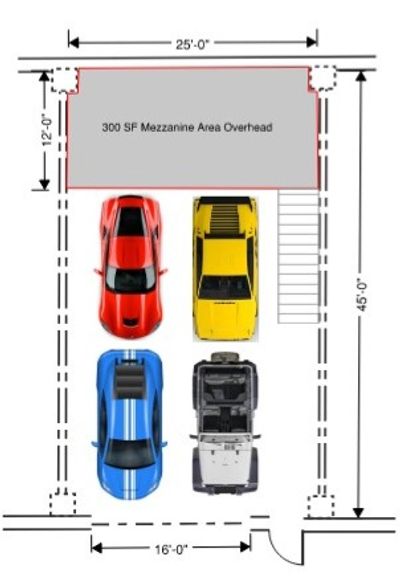 Garage units are typically 25' wide x 45' deep (1,125 SF) with a 300 SF Mezzanine in the rear of each unit. This provides room on the main floor for four standard vehicles with plenty of room under the mezzanine for whatever you can envision. The stairs to the mezzanine is tucked in line with the main entry door and the open mezzanine area provides space for many uses.